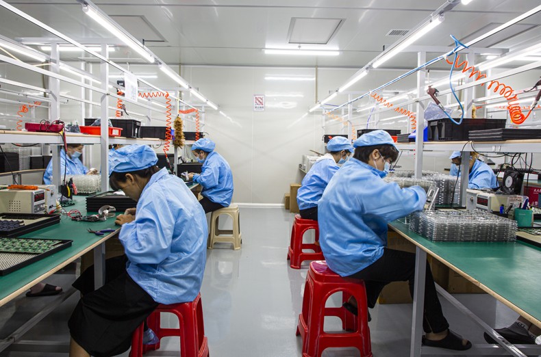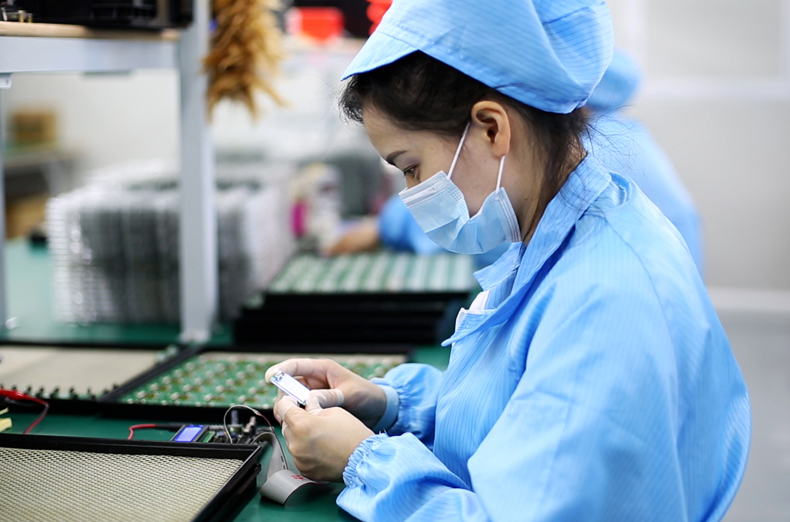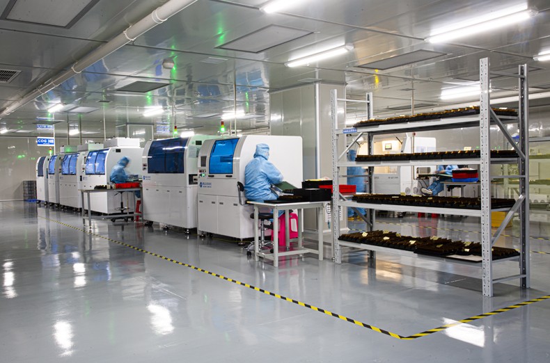 繪晶科技在液晶屏生產(chǎn)現(xiàn)場(chǎng)很重視靜電防護(hù),空調(diào)無塵生產(chǎn)車間,員工一律穿防靜電服,防靜電鞋,進(jìn)入現(xiàn)場(chǎng)前要先放靜電。以免人體自帶靜電或者移動(dòng)過程中產(chǎn)生靜電。作業(yè)員應(yīng)嚴(yán)格按照規(guī)程作業(yè),嚴(yán)禁人體任何部位直接接觸屏、模組中的接口、引腳等金屬導(dǎo)電部分。此外,保持生產(chǎn)場(chǎng)地空間有合理的溫度和濕度,溫度控制在28度左右,濕度在60%左右。這樣整個(gè)空間就形成了以空氣為導(dǎo)電體的放電體。這樣在這個(gè)空間里各種摩擦運(yùn)動(dòng)產(chǎn)生的靜電就會(huì)得到及時(shí)有效的釋放。