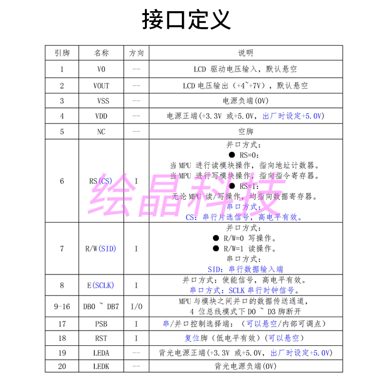 工作電壓3.3V或者5V,出廠默認(rèn)5V。提供三種與MPU通訊方式:4位、8位并行,串行通訊(默認(rèn)出廠未固定,用戶自己控制PSB 來(lái)選擇)