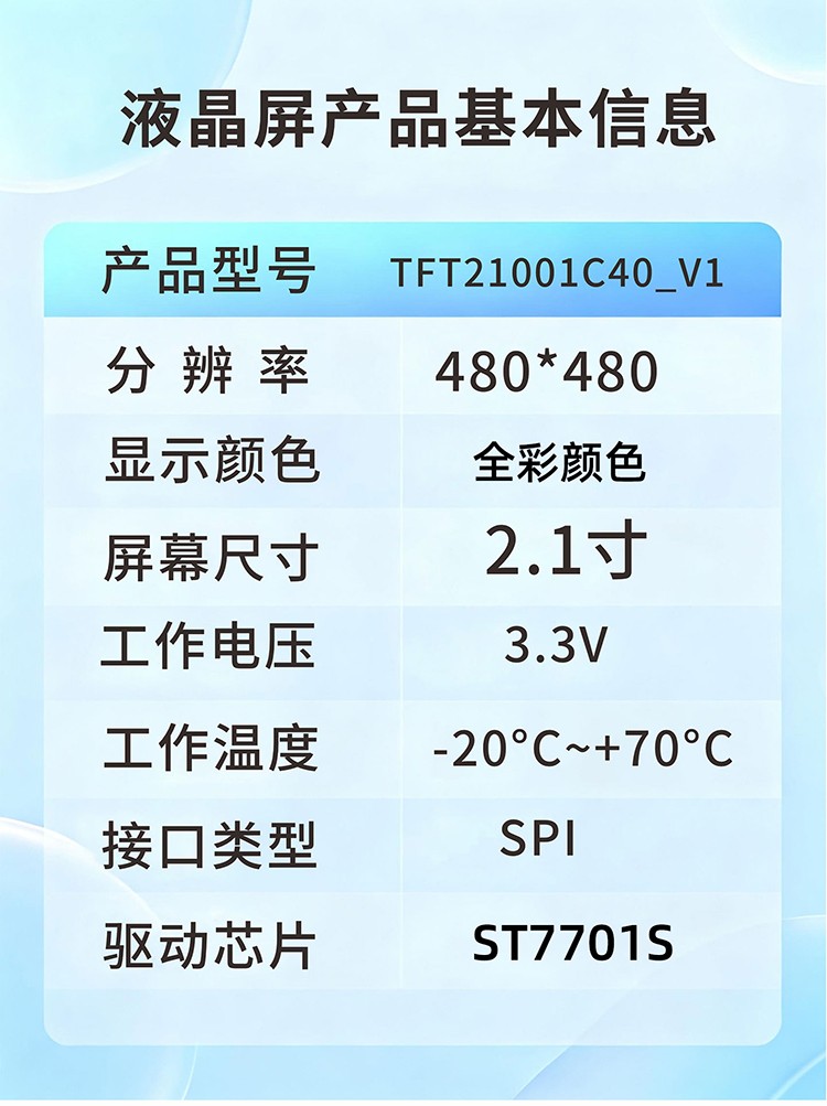 • 2.1寸圓形TFT彩屏液晶屏LCD屏彩色顯示480*480分辨率