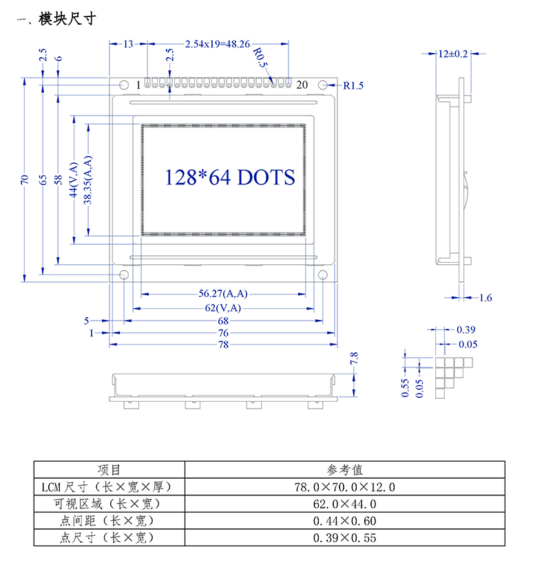 • 2.7寸12864點陣液晶屏顯示模塊藍白LCD